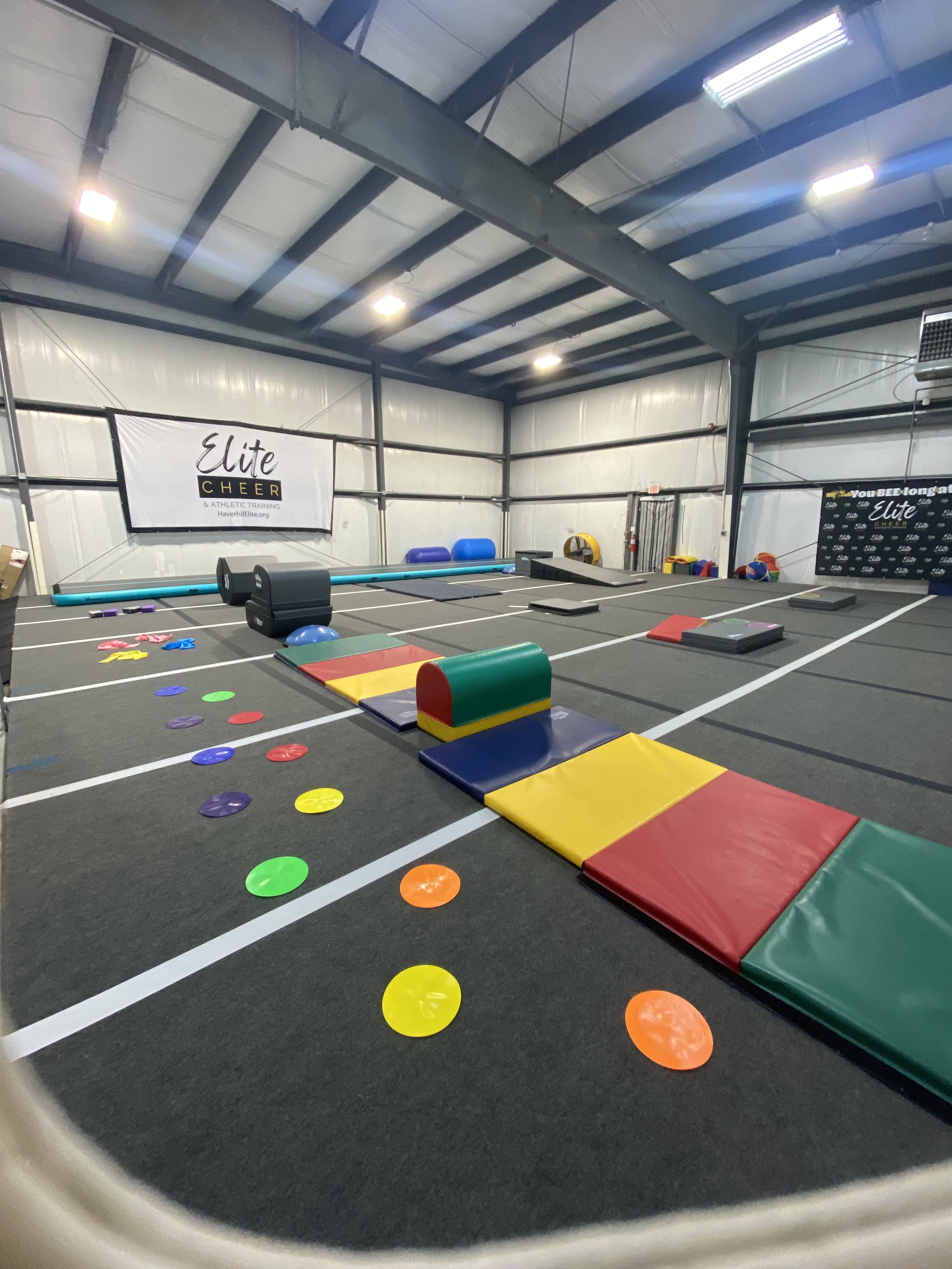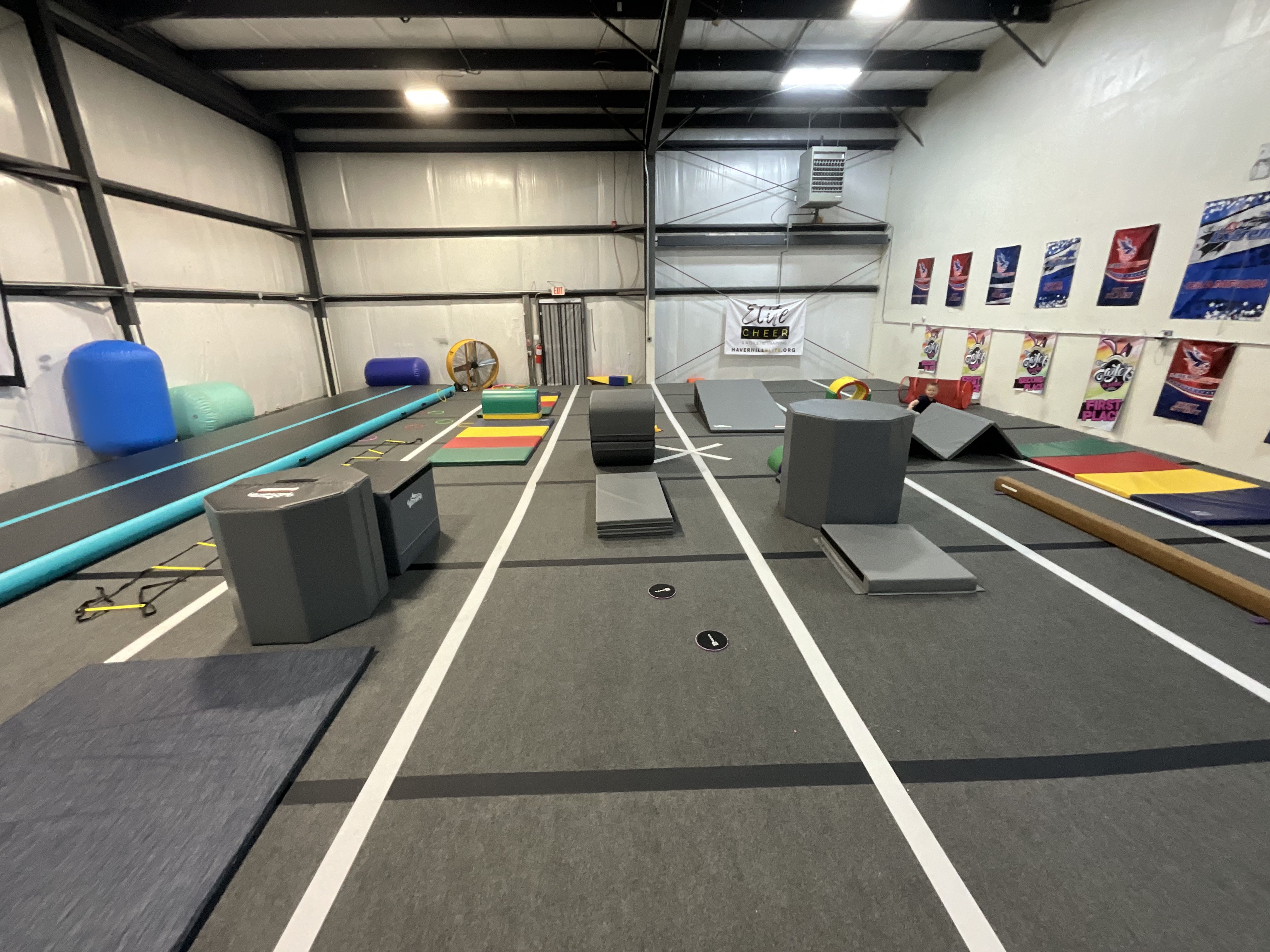 At our former location we offered a brand new spring floor with 7 panels, Commercial Air Track, panel mats, tumbling rollers and resources, wedge mats, stretching apparatuses and more!
